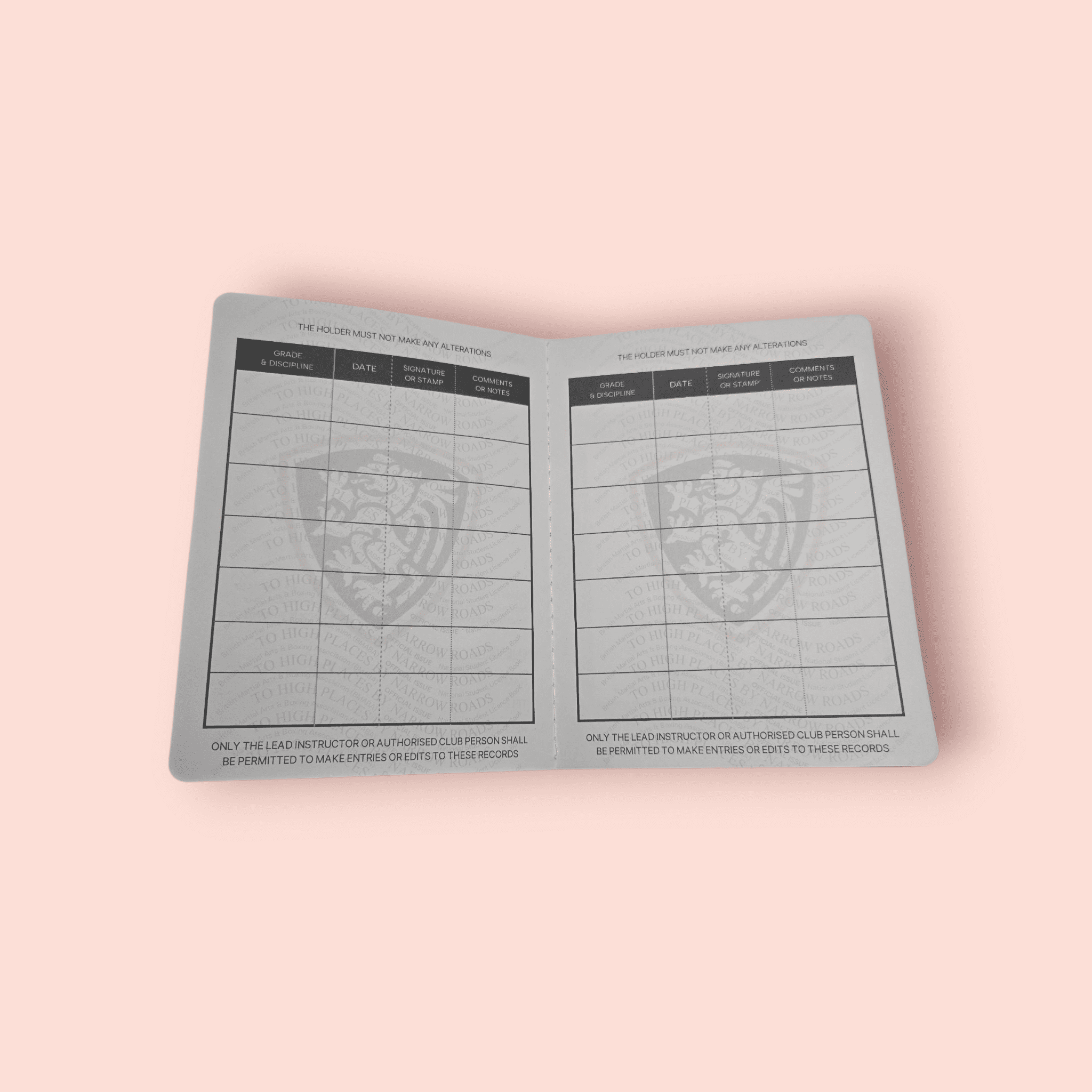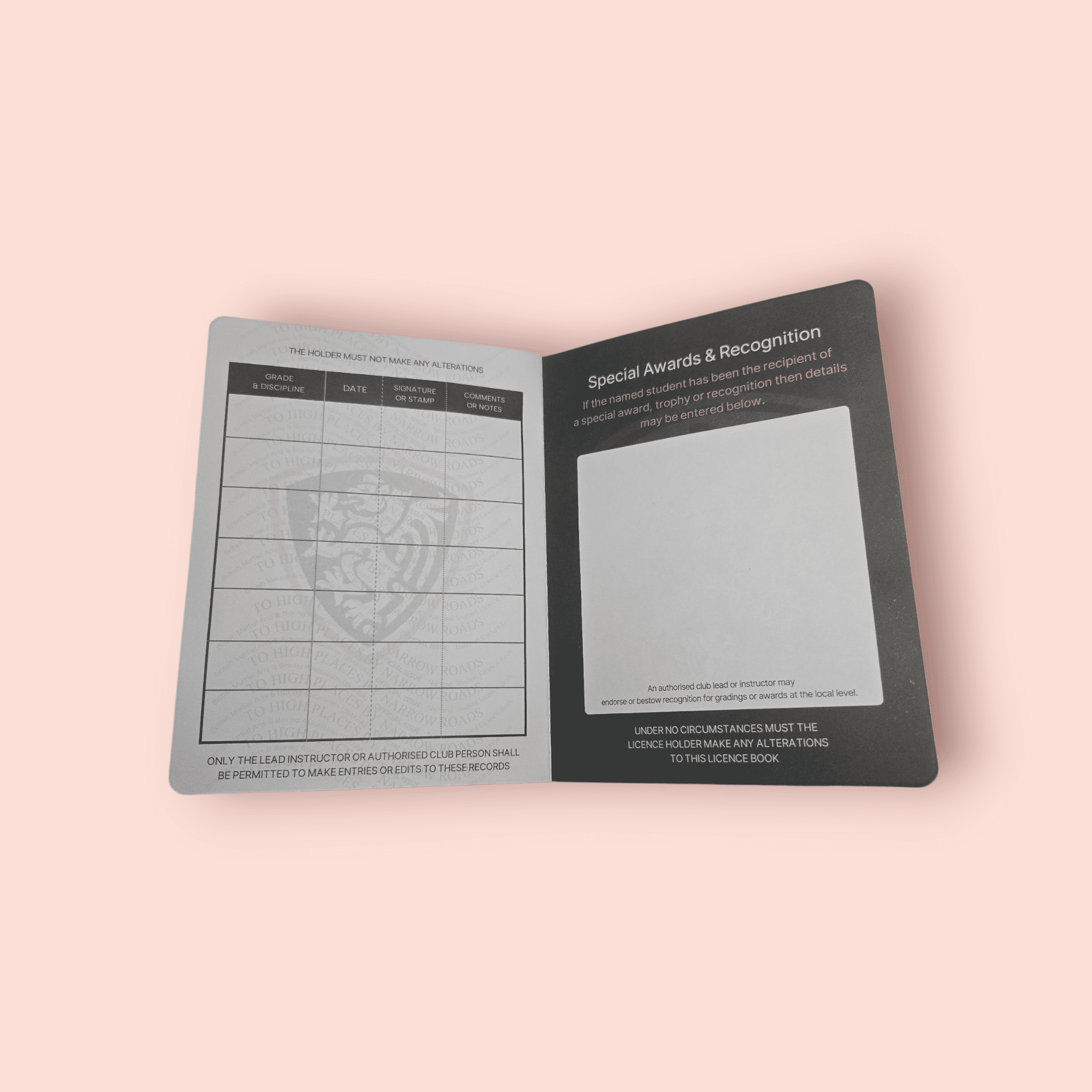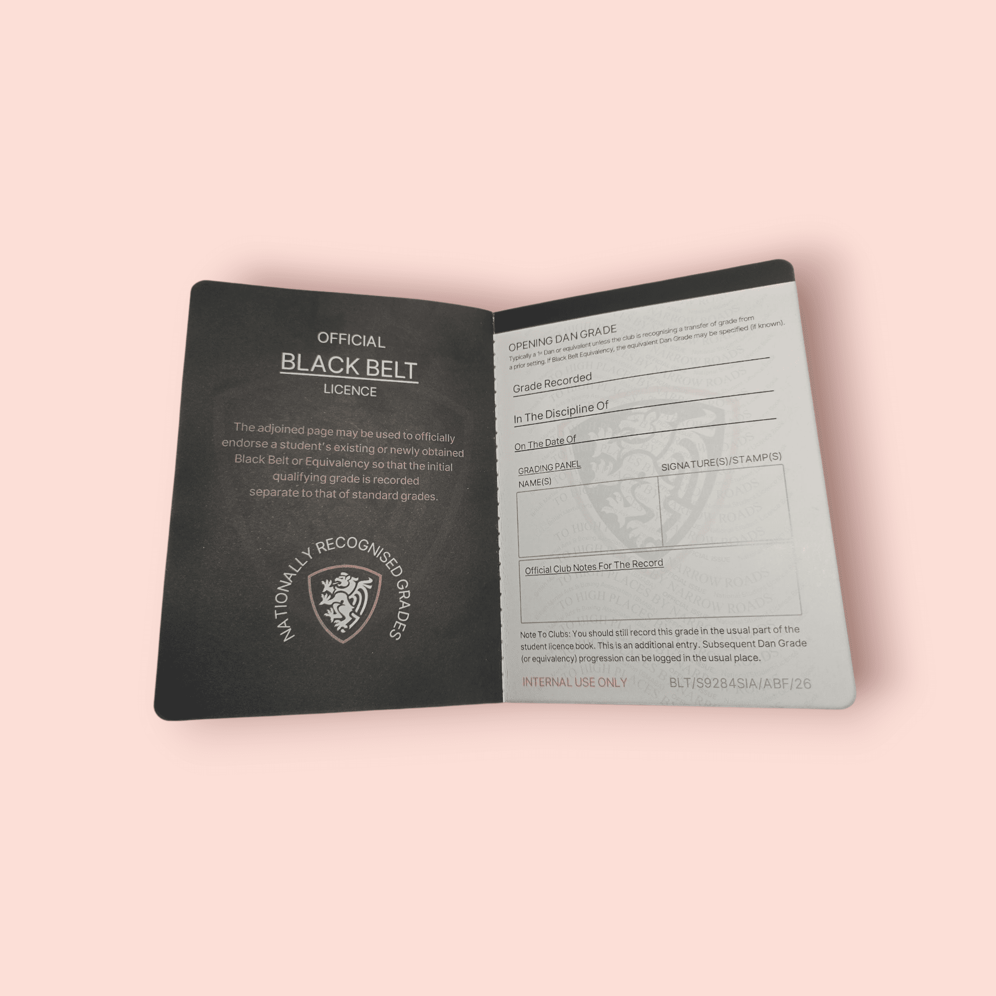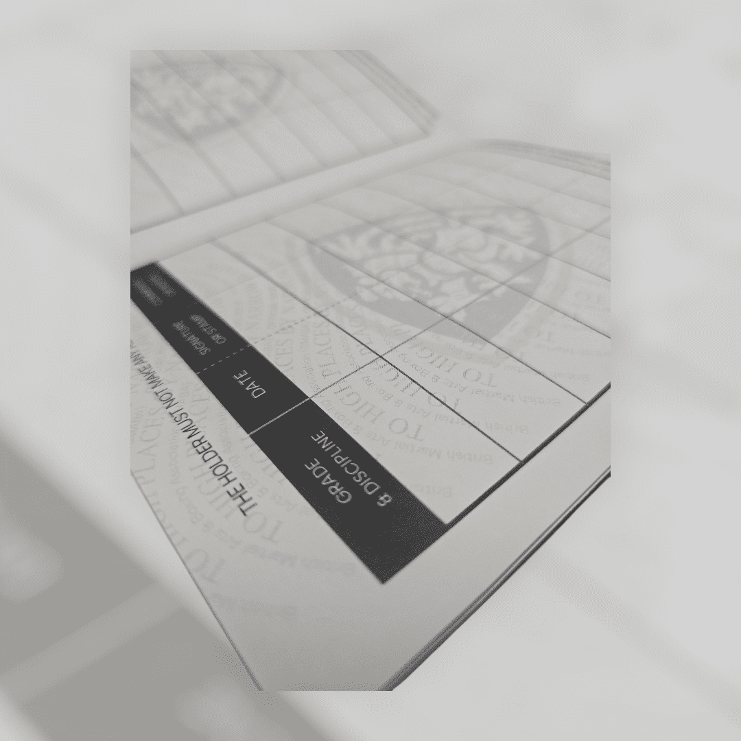 This licence book is designed to support nationally recognised grading records, providing consistency, authenticity, and professionalism for clubs and students alike. It offers a clear separation between standard grading progression and official Black Belt recognition, ensuring key milestones are properly recorded.